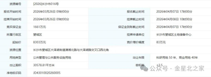 从挂牌信息来看,地块出让面积30578.81平方米,用地性质为公共管理与公共服务设施用地,其中科研用地出让年限50年、商业用地40年,容积率≤3.5,起始价8303万元。