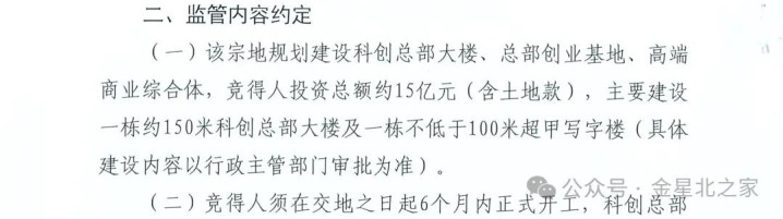 (一)该宗地规划建设科创总部大楼、总部创业基地、高端商业综合体,竞得人投资总额约15亿元(含土地款),主要建设一栋约150米科创总部大楼及一栋不低于100米超甲写字楼(具体建设内容以行政主管部门审批为准)。