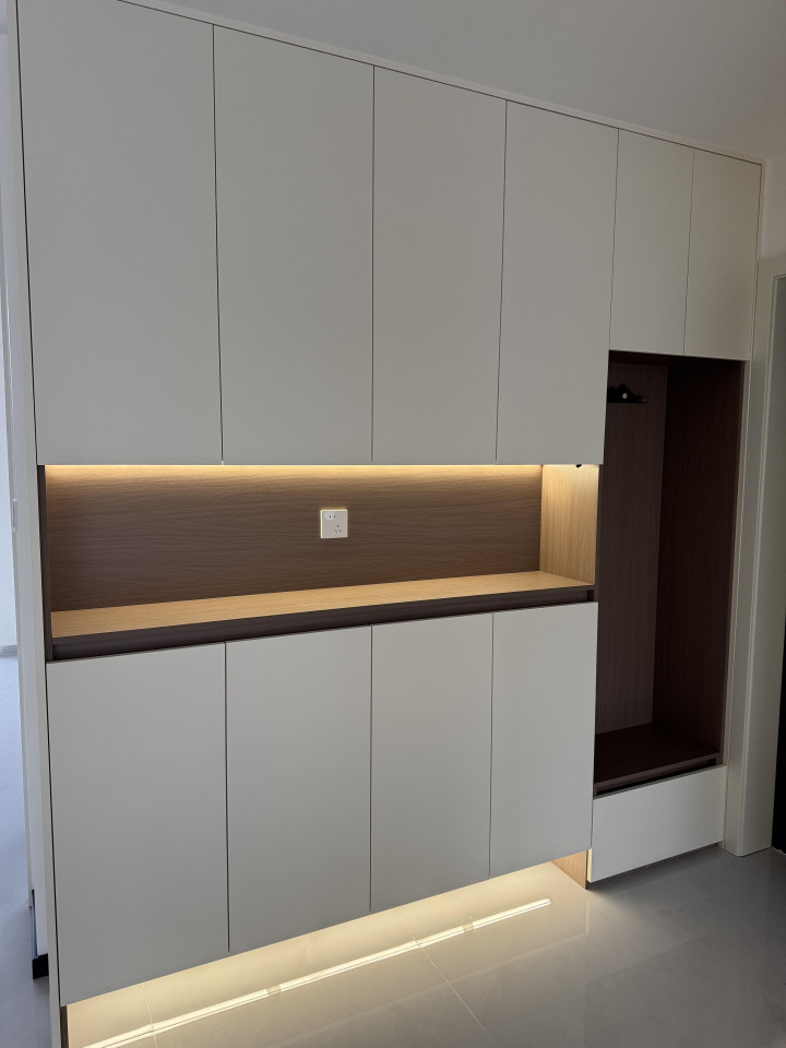 西安高新配资 奶油白肤感柜门➕胡桃木柜体两层感应灯带氛围感十足~